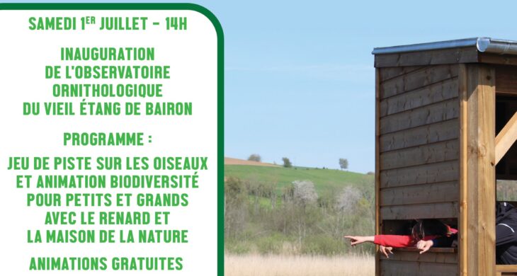 Venez assister à l’inauguration de l’observatoire ornithologique du vieil-étang de Bairon le samedi 1er juillet ! À cette occasion, vous pourrez prendre part à différentes animations proposées par le ReNArd et la Maison de la Nature jusqu’à 17h !