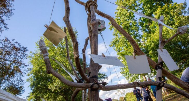 A la fin du parcours, une invitation à écrire ou dessiner ses émotions et sensations puis les accrocher sur l’arbre à mots. Les productions font l’objet de chansons improvisées, comme un retour in-situ et immédiat.
