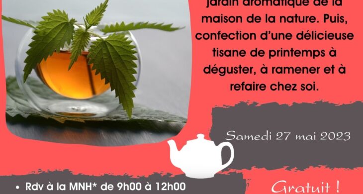 Sortie botanique et reconnaissance de quelques espèces de plantes à tisane dans le jardin aromatique de la maison de la nature. Puis, confection d’une délicieuse tisane de printemps à déguster, à ramener et à refaire chez soi.