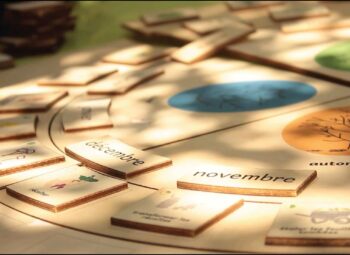 Jeux sur table : empreintes des mammifères, silhouettes oiseaux à retrouver, jeux sensoriels (sacs à toucher, boites à odeurs...), mémory rondelles à toucher matière de la nature...