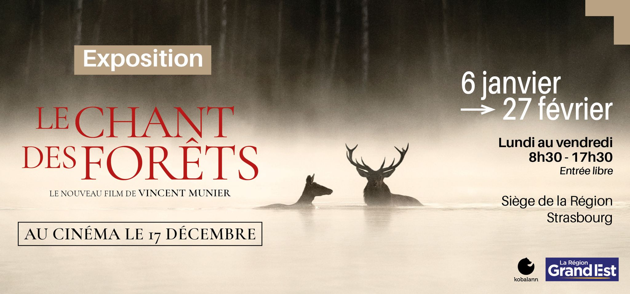 Du 6 janvier au 27 février 2026, le hall d’exposition du siège de la Région à Strasbourg accueille des photographies de Vincent Munier, réalisateur animalier dont le dernier film, « Le Chant des forêts » célèbre la faune des Vosges.