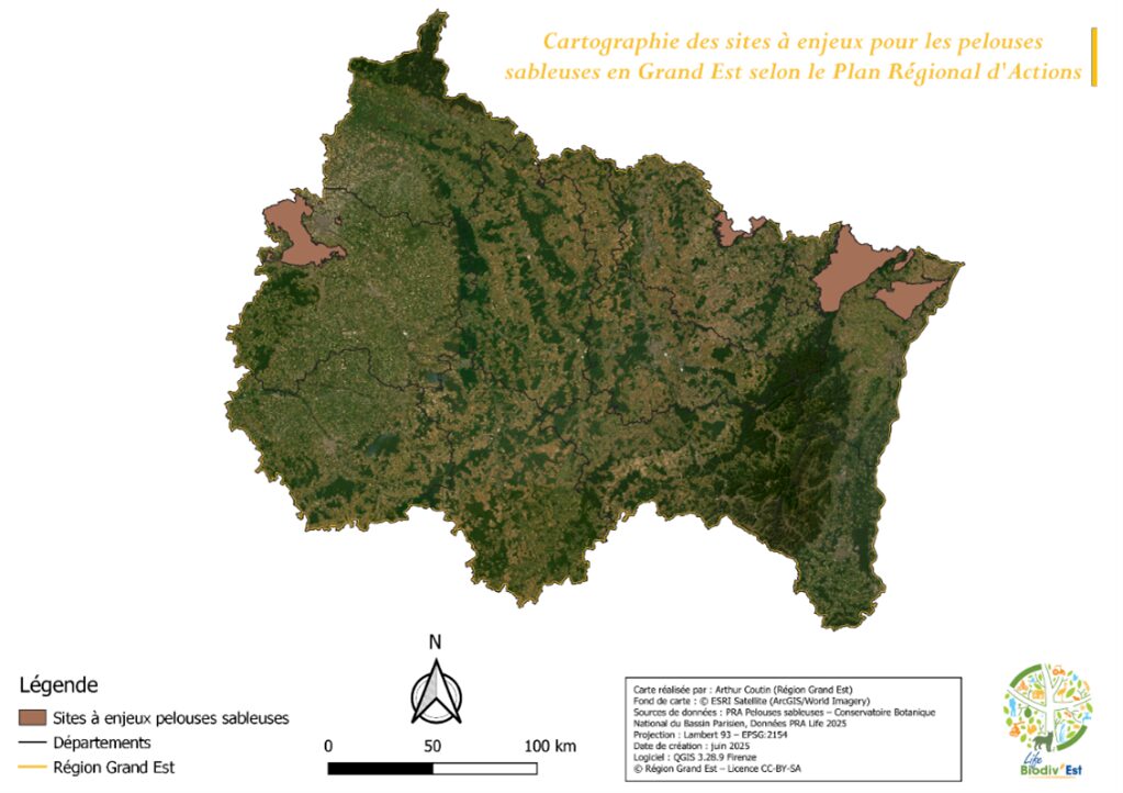 Cartographie des zones favorables à la présence de sites de pelouses sableuses à enjeux du Grand Est. ©Arthur Coutin